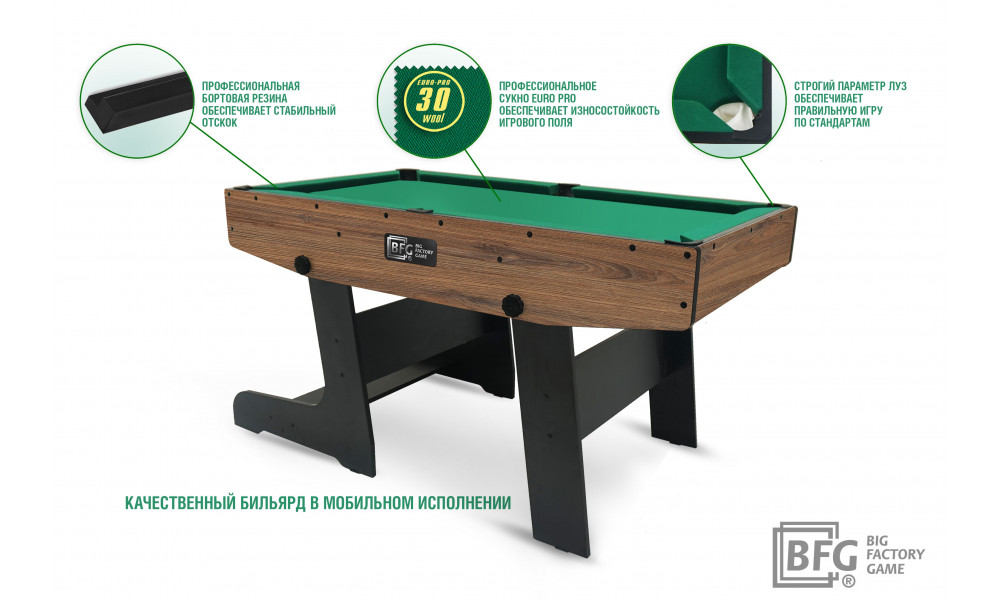 Еще одним преимуществом данной модели является удобный механизм складывания, позволяющий без особых усилий быстро сложить или разложить бильярдный стол. Благодаря складной конструкции опорных ножек, бильярдный стол при хранении занимает минимум пространства. Компактные размеры делают транспортировку и перемещение стола очень удобным.